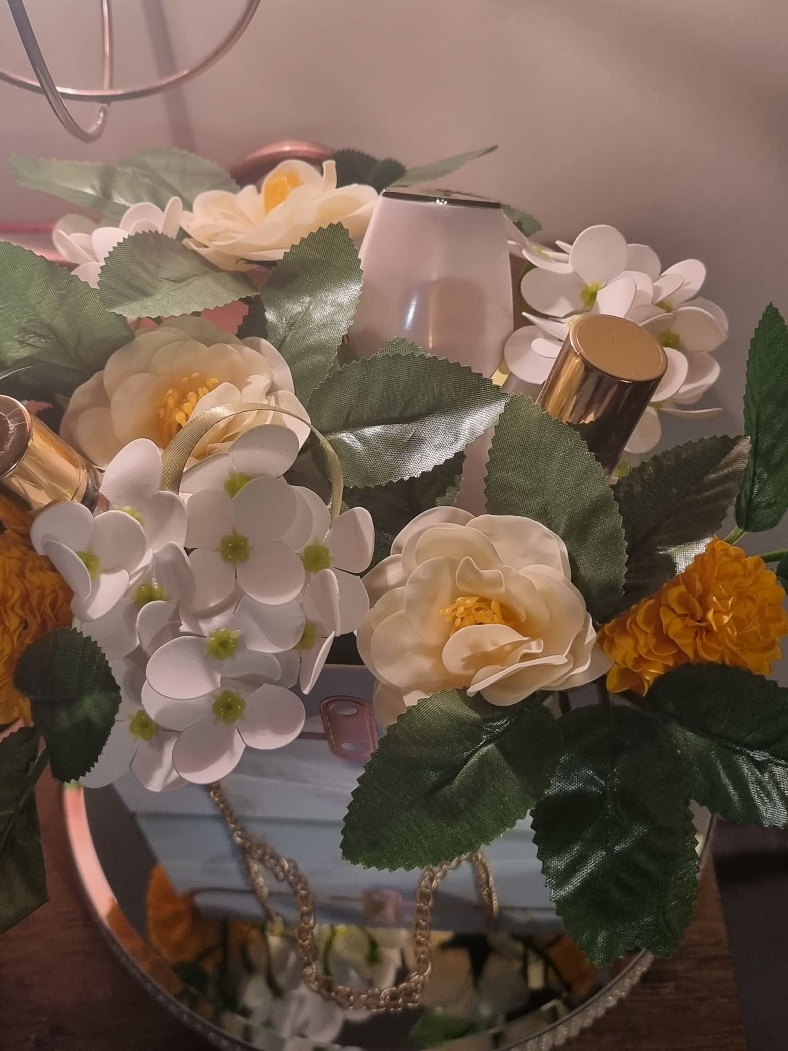 What a gift !! this beautiful set contains a 100ml of Seno Pour Femma inspired by Daisy . also contains 2 x 20 ml . complete with an array of soap flowers
